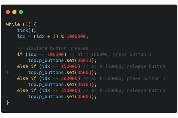 The reader is then given the job of making a modification to the design: adding button peripherals, which are then tested in both simulation and on the ULX3S board if available.
